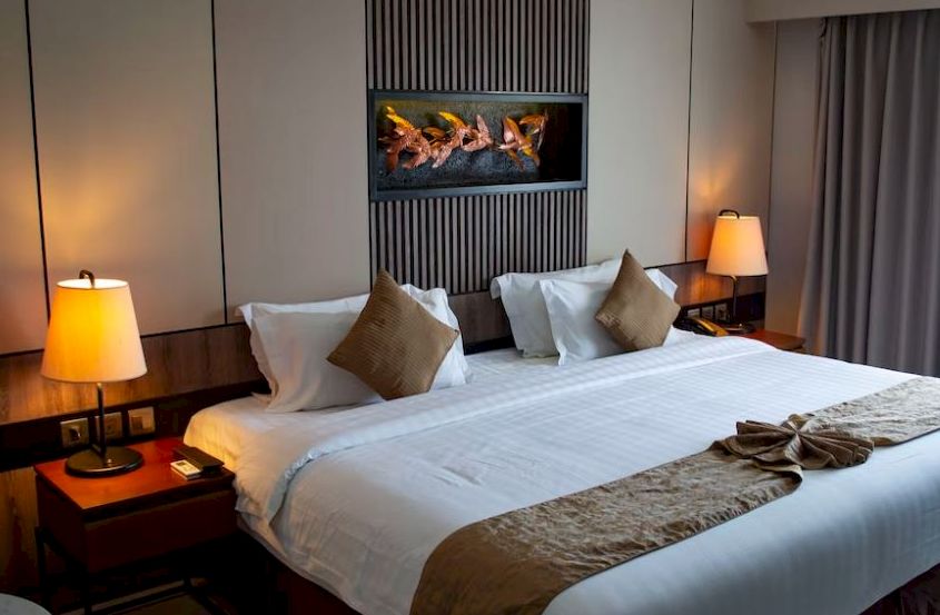 • A cozy hotel room with a large bed, decorative pillows, side tables with lamps, and curtains, creating a welcoming atmosphere.