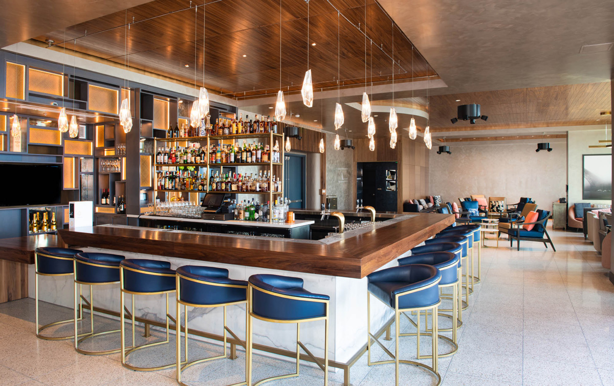 The image shows a modern bar with blue stools, a well-stocked bar area, hanging lights, and a spacious seating area in the background.