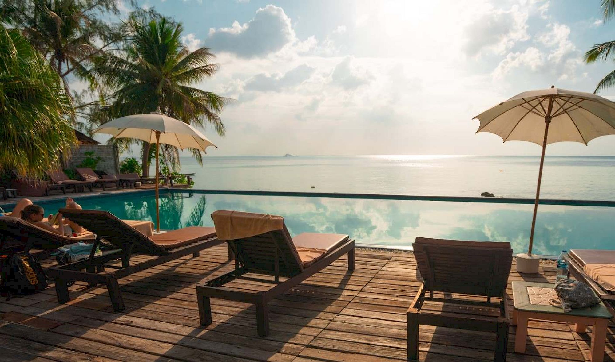 A tropical poolside scene with loungers, umbrellas, and a view of the ocean under a partly cloudy sky.