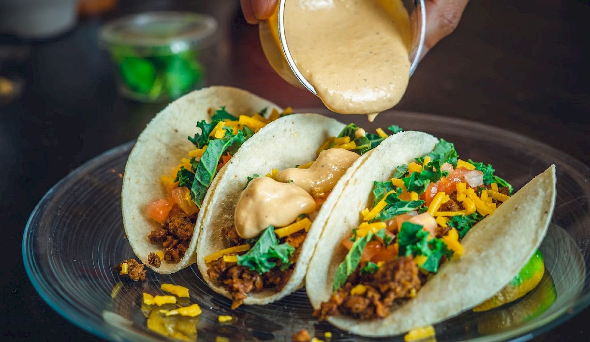 Three tacos filled with meat, cheese, and greens on a plate, with sauce being poured over them.