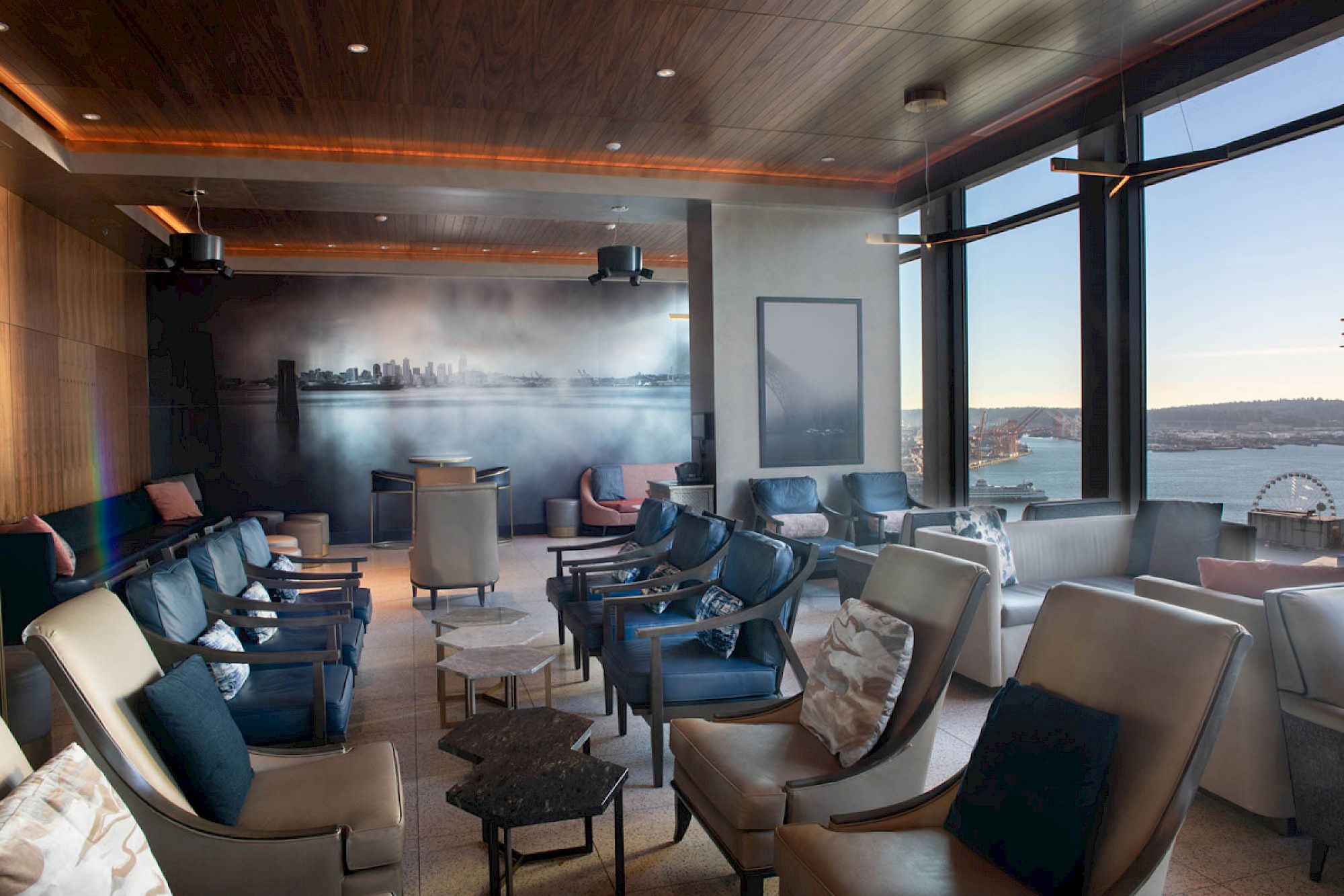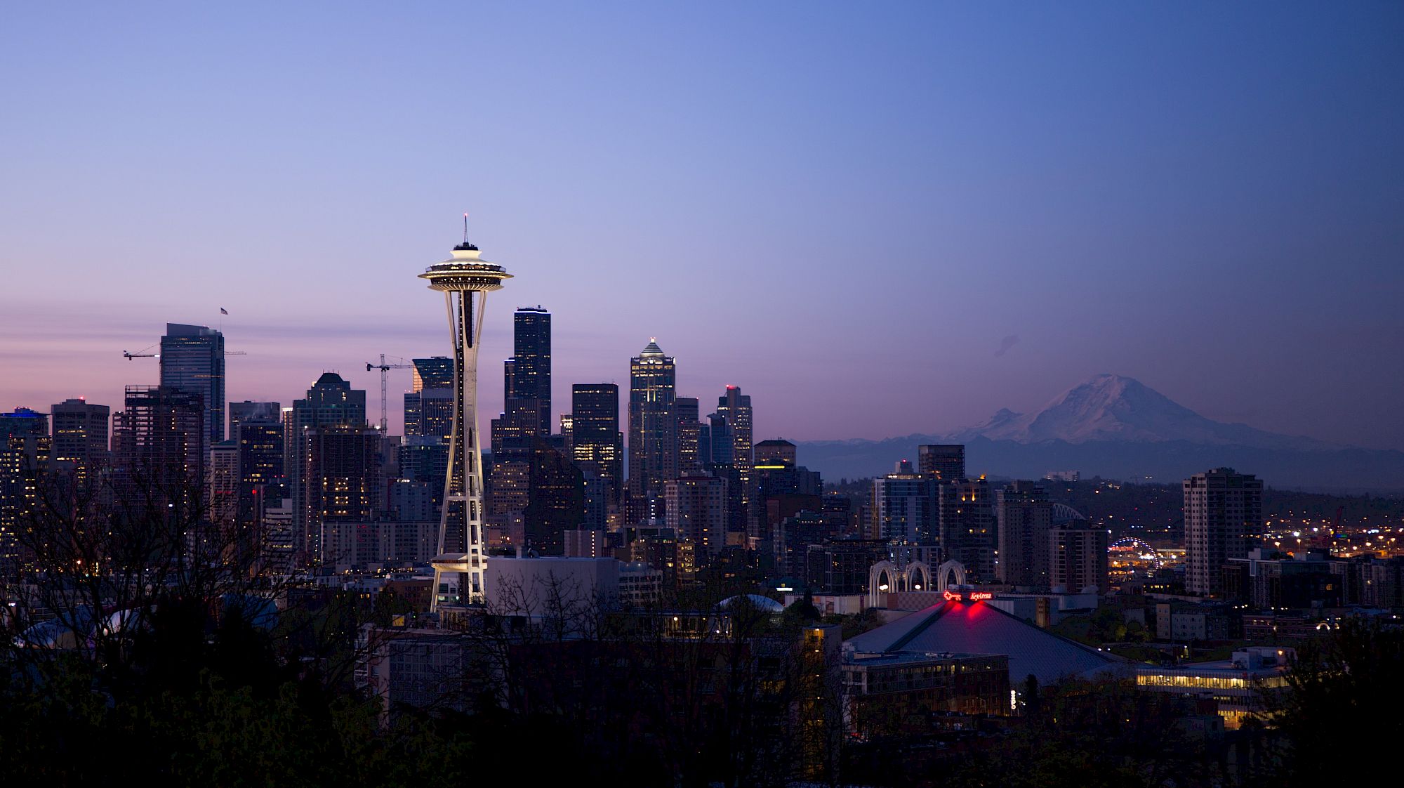 The image shows the Seattle skyline at dusk, featuring the Space Needle and Mount Rainier in the distance under a twilight sky.